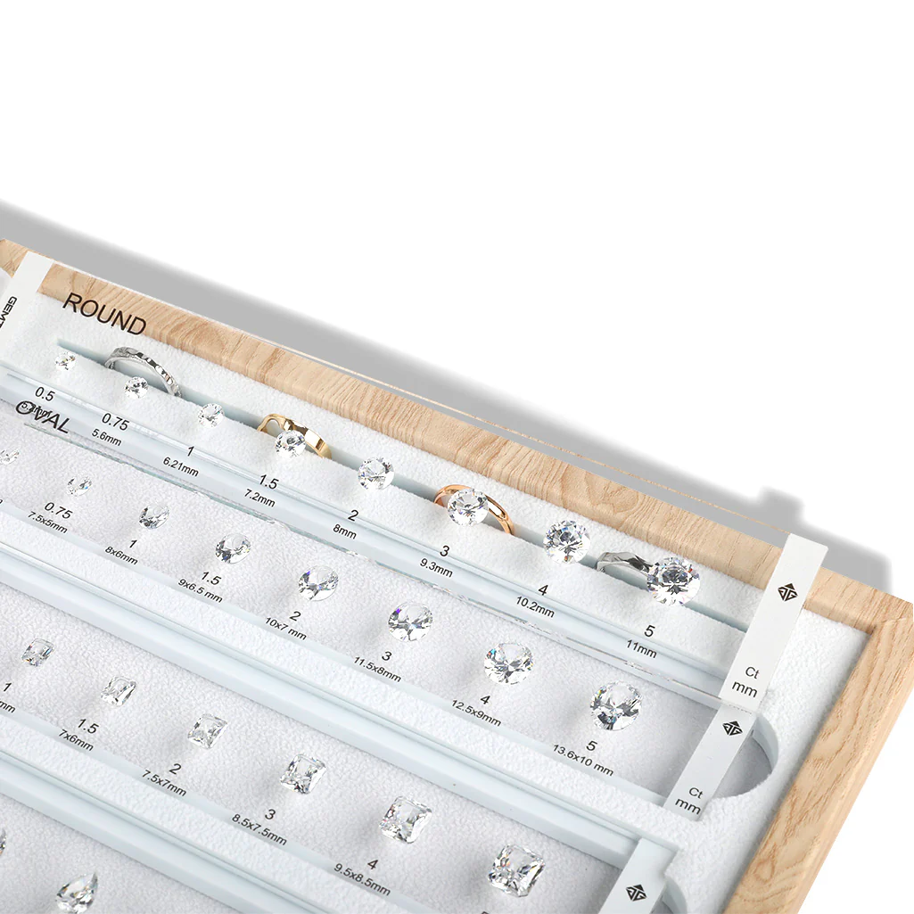 This comprehensive set includes 10 acrylic strips, each 3mm thick, and each strip contains 8 high-quality 5A cubic zirconia stones, resulting in a total of 80 stones. These stones represent 10 of the most popular diamond shapes – Round, Princess, Emerald, Asscher, Marquise, Oval, Radiant, Pear, Heart, and Cushion – in sizes ranging from 0.5ct to 5ct, offering a true-to-life simulation of diamond size and cut.