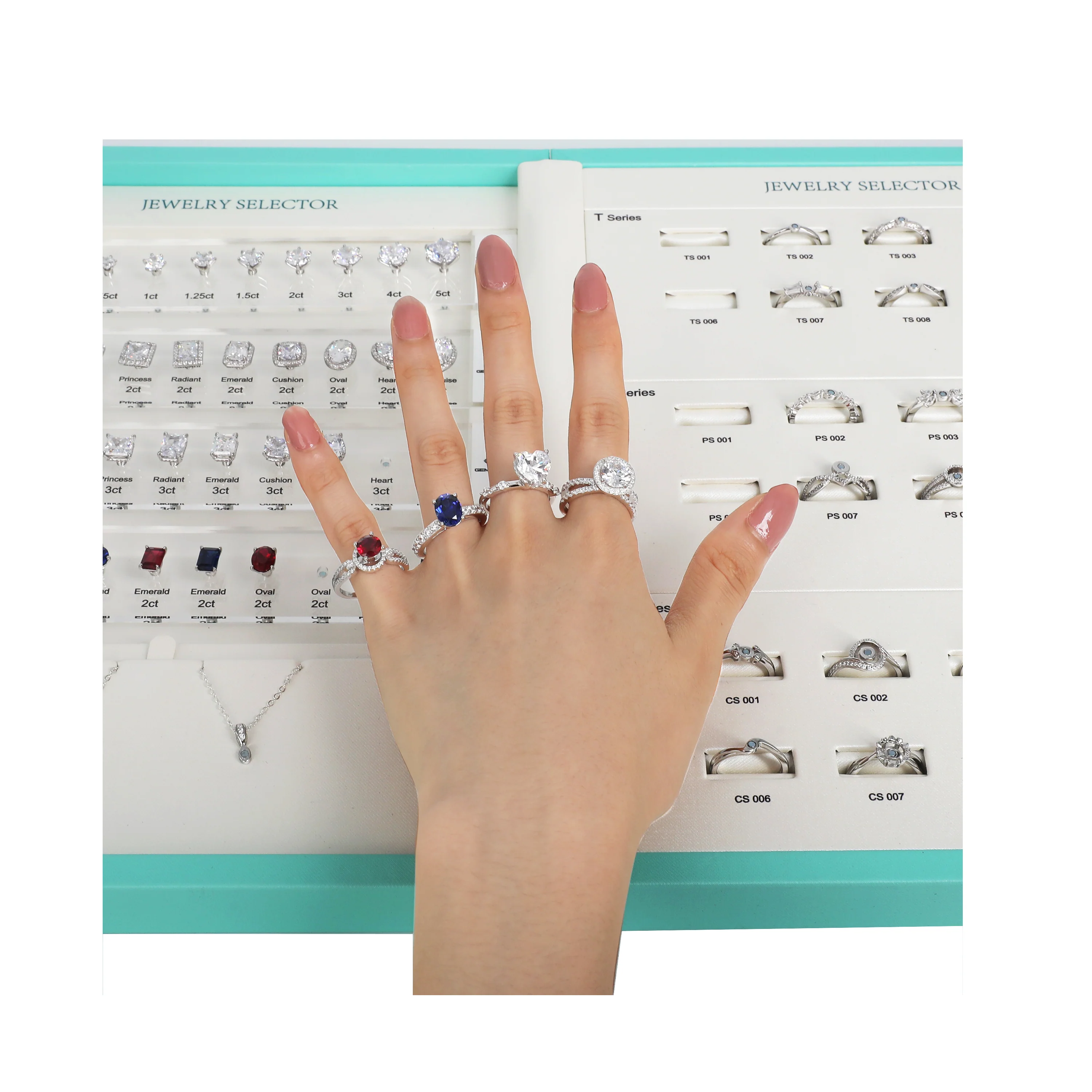 The Jewelry Builder DK112 features 30 classic rings made of 925 sterling silver coated with 9K gold, giving a luxurious and realistic look for display and trial. It also includes a wide selection of 40 high-quality cubic zirconia (CZ) stones in various shapes, sizes, and colors, elegantly arranged on four interchangeable acrylic strips. These strips can be used as a full set or attached individually to any ring holder, earring, or necklace for real-time customization and viewing.
